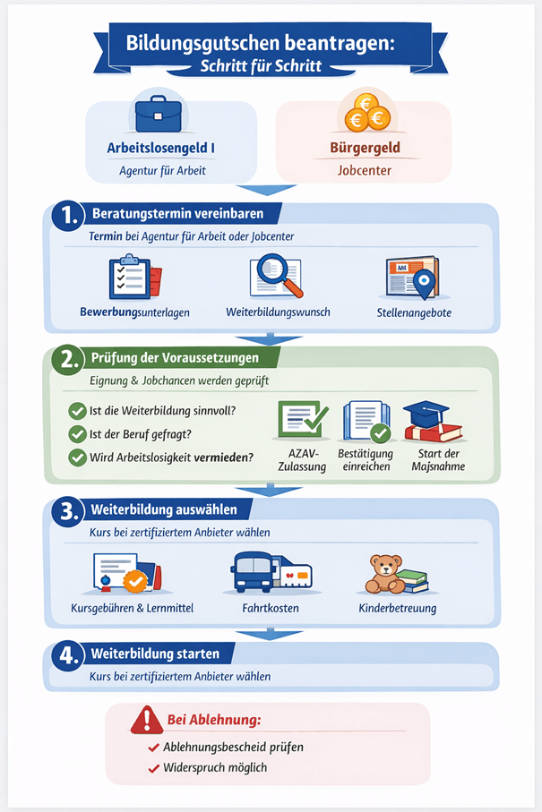 Wird Ihr Antrag abgelehnt, erhalten Sie einen schriftlichen Bescheid. Gegen diese Entscheidung können Sie innerhalb der gesetzlichen Frist Widerspruch einlegen. Ein Widerspruch führt nicht automatisch zur Bewilligung. Er kann jedoch sinnvoll sein, wenn neue Argumente oder zusätzliche Nachweise vorliegen. Der Antrag auf einen Bildungsgutschein ist ein strukturierter Prozess. Gute Vorbereitung erhöht Ihre Chancen deutlich. Entscheidend ist, dass Ihre Weiterbildung realistisch, arbeitsmarktrelevant und notwendig ist.