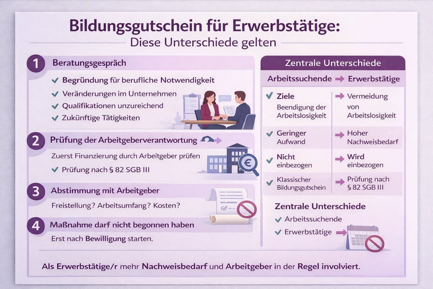 Für Erwerbstätige ist ein Bildungsgutschein möglich, aber die Hürden sind höher. Entscheidend ist der Nachweis, dass die Weiterbildung notwendig ist, um Ihre Beschäftigung zu sichern oder Ihre Arbeitsmarktchancen langfristig zu erhalten. Worin die Unterschiede zwischen Arbeitssuchenden und Erwerbstätigen bei der Antragsstellung liegen, zeigt folgende Infografik.