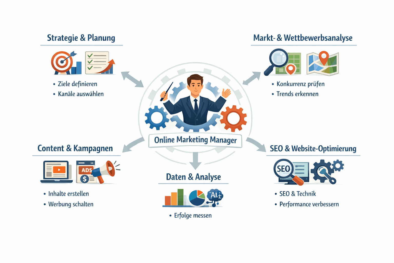 Ein Online Marketing Manager plant, steuert und optimiert alle digitalen Marketingmaßnahmen eines Unternehmens. Dazu gehören unter anderem Suchmaschinenoptimierung (SEO), bezahlte Werbung (SEA), Content-Marketing und Social Media. Im Alltag analysiert er Zielgruppen, entwickelt Strategien, setzt Kampagnen um und wertet Ergebnisse aus. Besonders wichtig ist die Verbindung dieser Maßnahmen. Es geht nicht um einzelne Aktionen, sondern um ein abgestimmtes System. Ziel ist es, Sichtbarkeit zu erhöhen, Besucher zu gewinnen und diese in Kunden zu verwandeln. Dabei spielt die kontinuierliche Optimierung eine zentrale Rolle.
