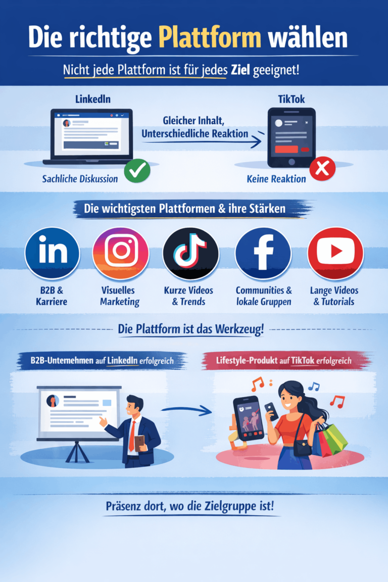 Wer Social Media gezielt einsetzen möchte, steht schnell vor einer zentralen Frage: Welche Plattform ist die richtige? Denn nicht jede Plattform eignet sich für jedes Ziel oder jede Zielgruppe. Stellen Sie sich vor, ein Unternehmen veröffentlicht denselben Inhalt gleichzeitig auf LinkedIn, Instagram und TikTok. Die Reaktionen fallen völlig unterschiedlich aus. Während der Beitrag auf LinkedIn sachlich diskutiert wird, bleibt er auf TikTok unbeachtet. Genau hier zeigt sich, wie wichtig die Wahl der richtigen Plattform ist.