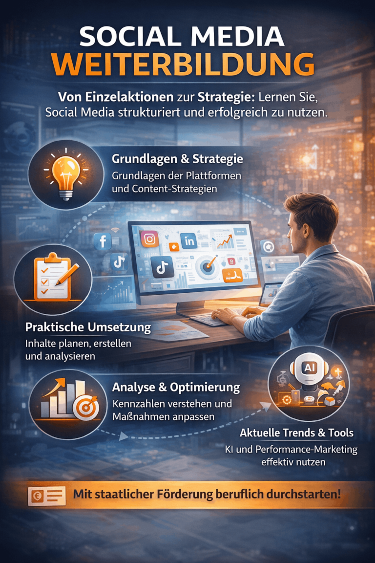Eine Social Media Weiterbildung vermittelt nicht nur Grundlagen, sondern vor allem praxisnahes Wissen, das direkt angewendet werden kann. Sie lernen, wie Plattformen funktionieren, wie Inhalte strategisch geplant werden und wie Sie Zielgruppen gezielt erreichen. Ein wichtiger Bestandteil ist auch die Analyse von Kennzahlen, um Inhalte kontinuierlich zu verbessern. Darüber hinaus werden Themen wie Social-Media-Werbung, Content-Erstellung und der Einsatz von KI behandelt. Viele Weiterbildungen sind zudem förderfähig, etwa über einen Bildungsgutschein oder das Qualifizierungschancengesetz. Dadurch können Sie sich beruflich weiterentwickeln oder neu orientieren, ohne ein hohes finanzielles Risiko einzugehen.