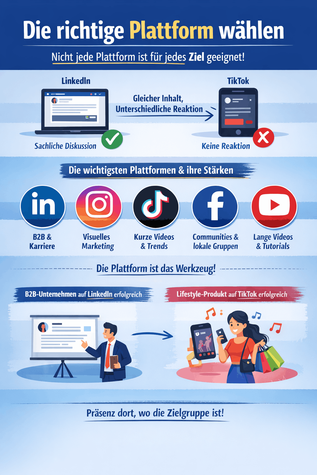 Ein entscheidender Punkt ist: Nicht jede Plattform muss genutzt werden. Erfolgreiches Social Media Marketing bedeutet nicht, überall präsent zu sein, sondern dort aktiv zu sein, wo die eigene Zielgruppe unterwegs ist. Zur besseren Veranschaulichung folgt hierzu ein Beispiel: Ein Unternehmen im B2B-Bereich wird auf LinkedIn deutlich bessere Ergebnisse erzielen als auf TikTok. Ein Lifestyle-Produkt hingegen kann auf Instagram oder TikTok schneller Aufmerksamkeit erzeugen. Wie Sie sehen, ist die Plattform nicht das Ziel – sie ist das Werkzeug. Wer versteht, wie die einzelnen Kanäle funktionieren und welche Inhalte dort wirken, kann Social Media gezielt einsetzen und nachhaltige Ergebnisse erzielen.