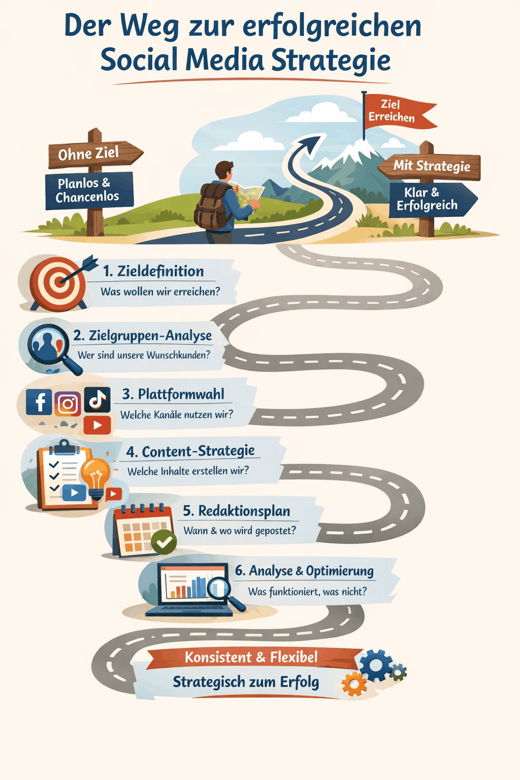 Stellen Sie sich Social Media wie eine Reise vor. Ohne Ziel posten Sie Inhalte, reagieren spontan und hoffen auf Ergebnisse. Mit einer Strategie haben Sie eine klare Route. Sie wissen, wohin Sie wollen und welche Schritte dafür notwendig sind. Genau dieser Unterschied entscheidet über Erfolg oder Misserfolg.